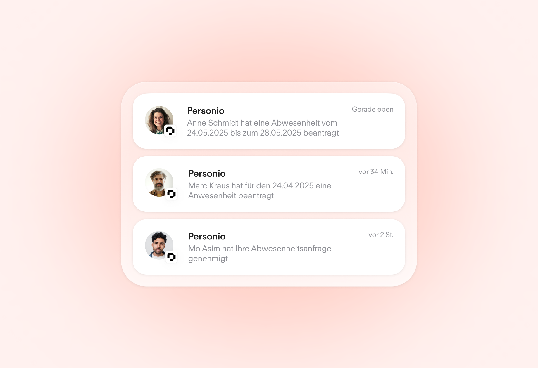 Steigern Sie die Zufriedenheit Ihrer Mitarbeitenden mit Benachrichtigungen in Echtzeit. Genehmigen Sie Abwesenheitsanträge und erfasste Arbeitsstunden schneller und einfacher durch Echtzeit-Benachrichtigungen – und steigern Sie so die Zufriedenheit Ihrer Mitarbeitenden.