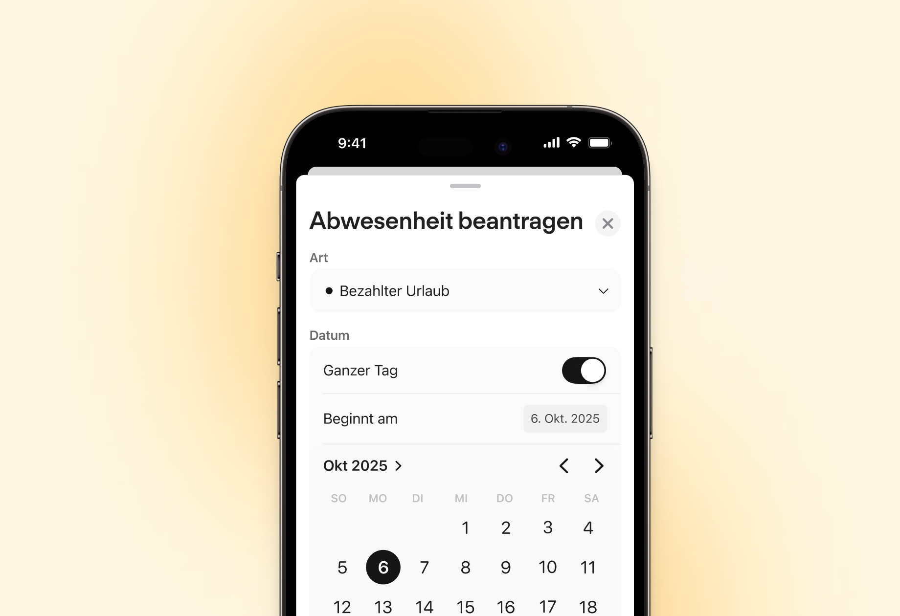 Beantragen Sie bei Bedarf schnell einen ganzen oder halben freien Tag. Geben Sie Mitarbeitenden die Möglichkeit, relevante Dokumente in wenigen Schritten übers Handy hochzuladen.