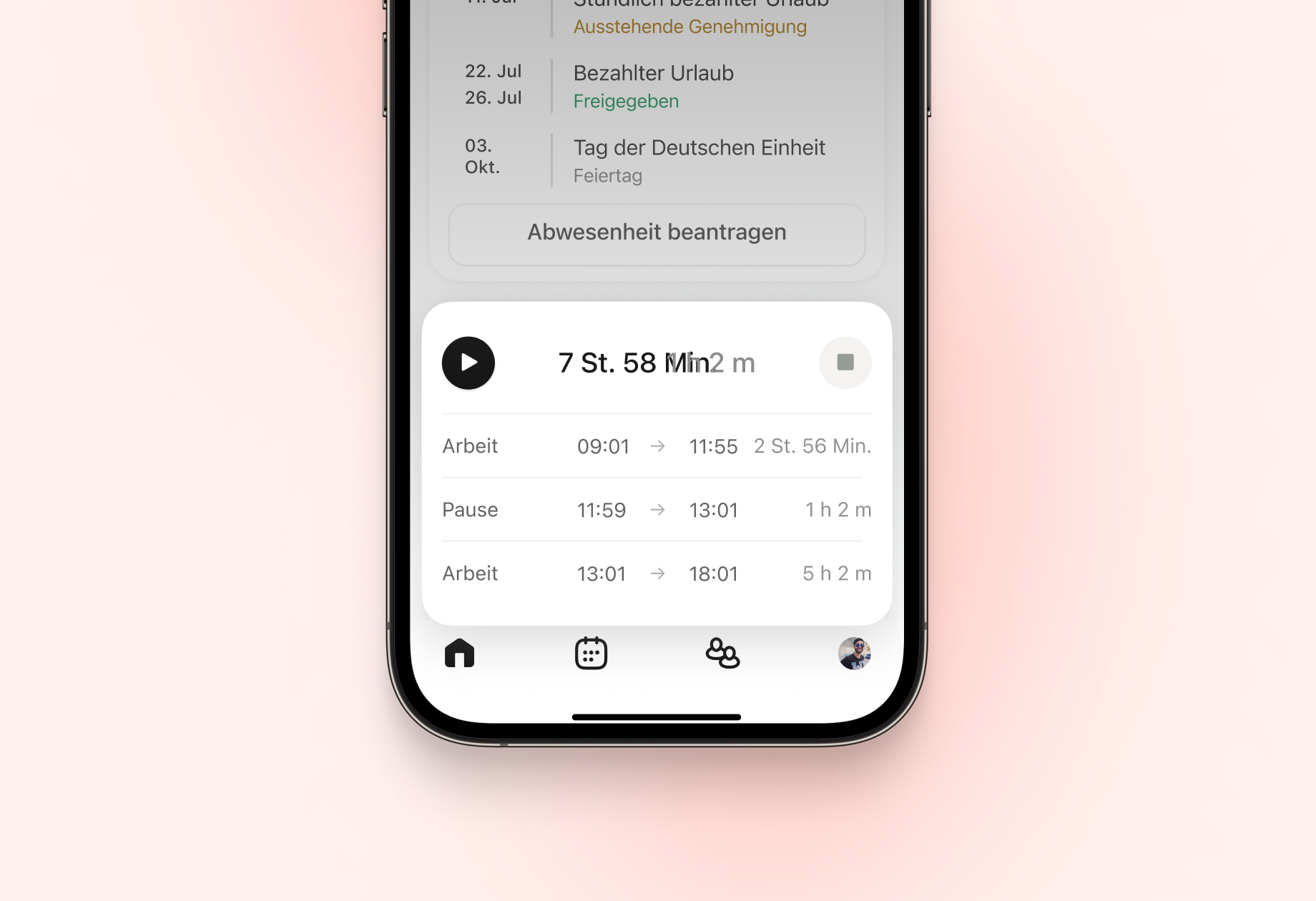 Ermöglichen Sie es Ihren Mitarbeitenden, Arbeitsbeginn und -ende zu erfassen, Pausen aufzuzeichnen und Anwesenheiten präzise in Echtzeit zu verwalten – unabhängig davon, an welchem Ort sie arbeiten.